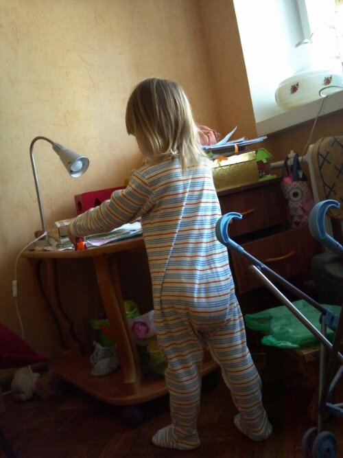 Машу завораживает папина футболка с болгарским алфавитом, все лампы и люстры.
