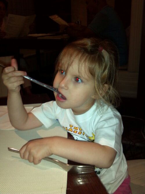 Маша очень любит есть с ложки, независимо от содержимого. Завидев ее, она широко открывает рот и мило причмокивает.
